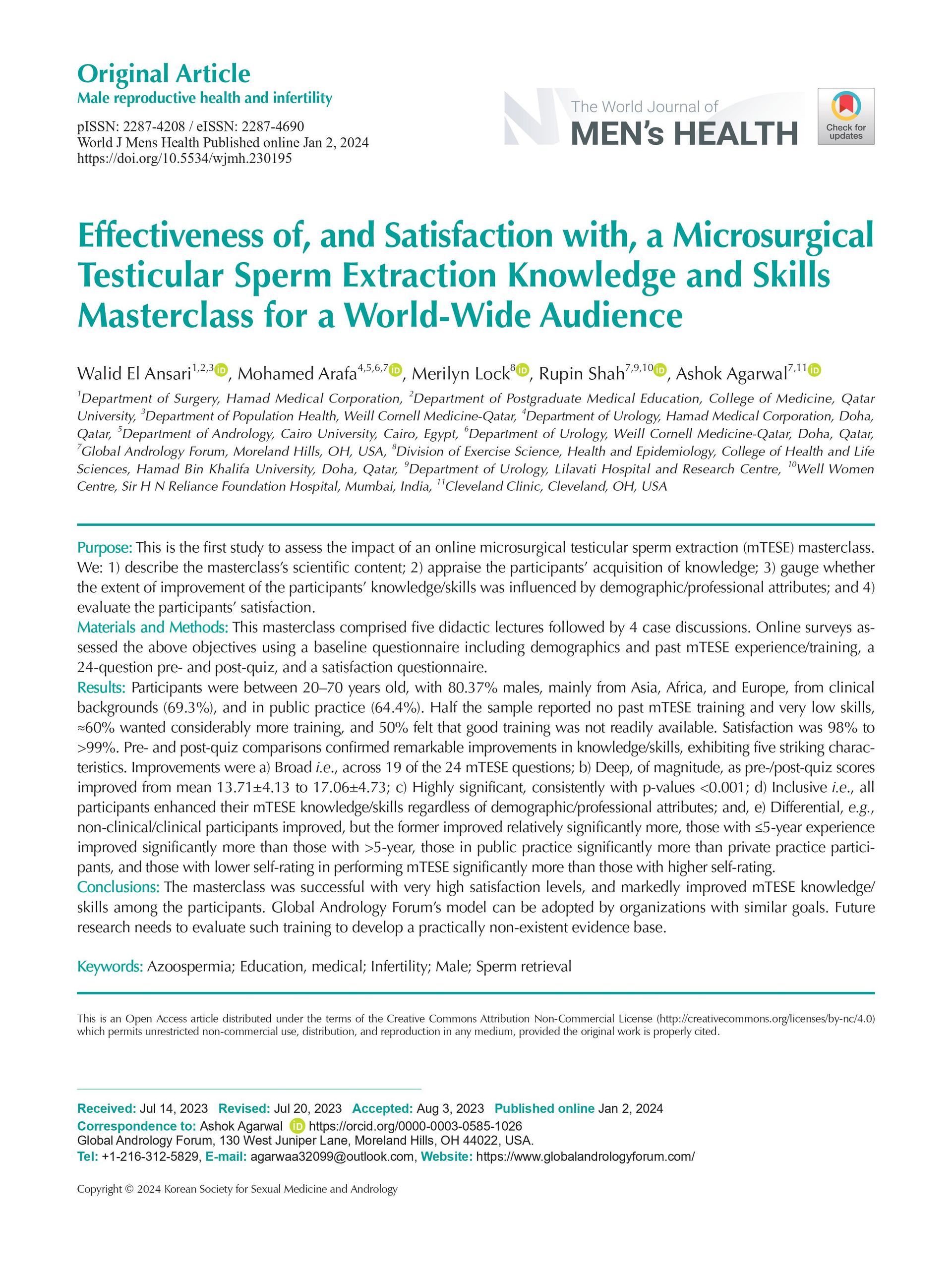 1. El Ansari W, Arafa M, Lock M, Shah R, Agarwal A. Effectiveness of, and satisfaction with, a microsurgical testicular sperm extraction knowledge and skills masterclass for a world-wide audience. World J Mens Health. 2024 Jul;42(3):574–86.